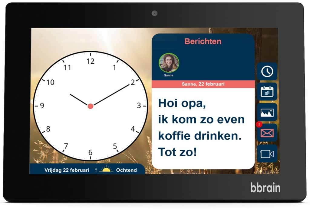 Er is op de BBRAIN geen optie om de tekst groter te maken. Ook is er geen optie om functies uit te schakelen (foto’s, berichten etc).