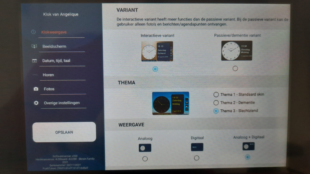 Er zijn 3 thema’s om uit te kiezen: standaard, dementie en slechtziend. Deze thema’s werken prima, alleen er is geen optie om eigen foto’s of kleuren als achtergrond te gebruiken.