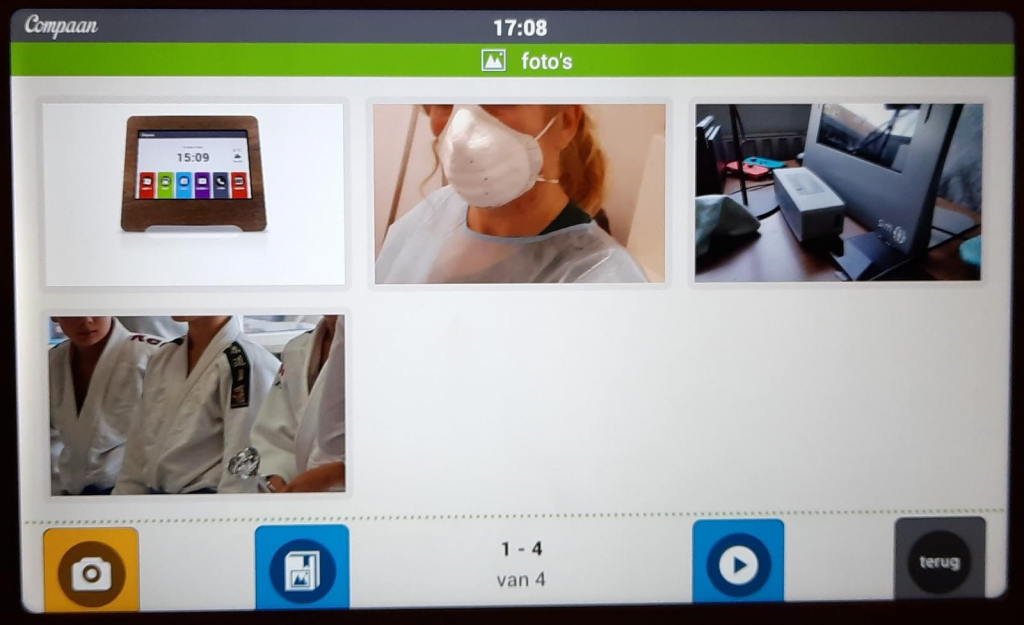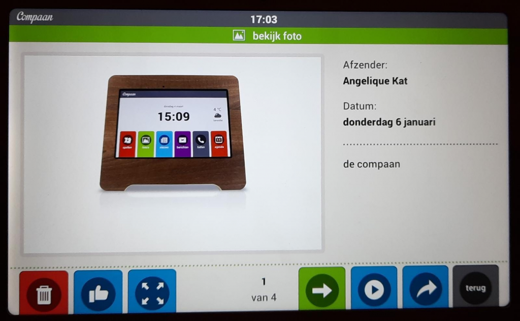 De Compaan heeft een uitgebreide foto’s app. Vanaf het portal kunnen er foto’s naar de klok worden gestuurd. Op de klok zelf komt dan een melding met een aantal opties: