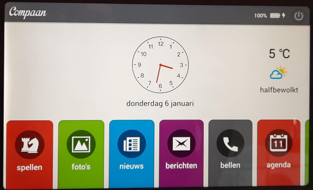 De interface van de Compaan is erg overzichtelijk en aanpasbaar. Alle knoppen onderaan kunnen individueel weggehaald worden. De klok zelf kan gewisseld worden tussen digitaal en analoog. De klok laat echter niet het dagdeel zien.